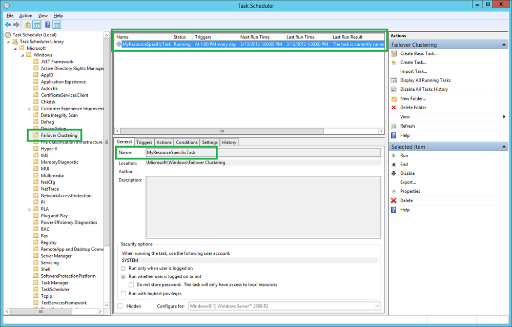 In previous releases of Windows Server, you could create a task that was local to a single node (server) that was part of a Failover Cluster, but the Task Scheduler did not have any understanding of the entire cluster. Configuring and managing tasks on a on a large scale 32 or 64 Node Cluster can be more challenging than maintaining them on a single machine. Manually copying tasks from one machine to another can become time consuming and error prone. Starting in Windows Server 2012, this experience is significantly improved as you can now use Clustered Scheduled Tasks for the tasks that you want to run on your cluster. There are three types of Clustered Scheduled tasks :
