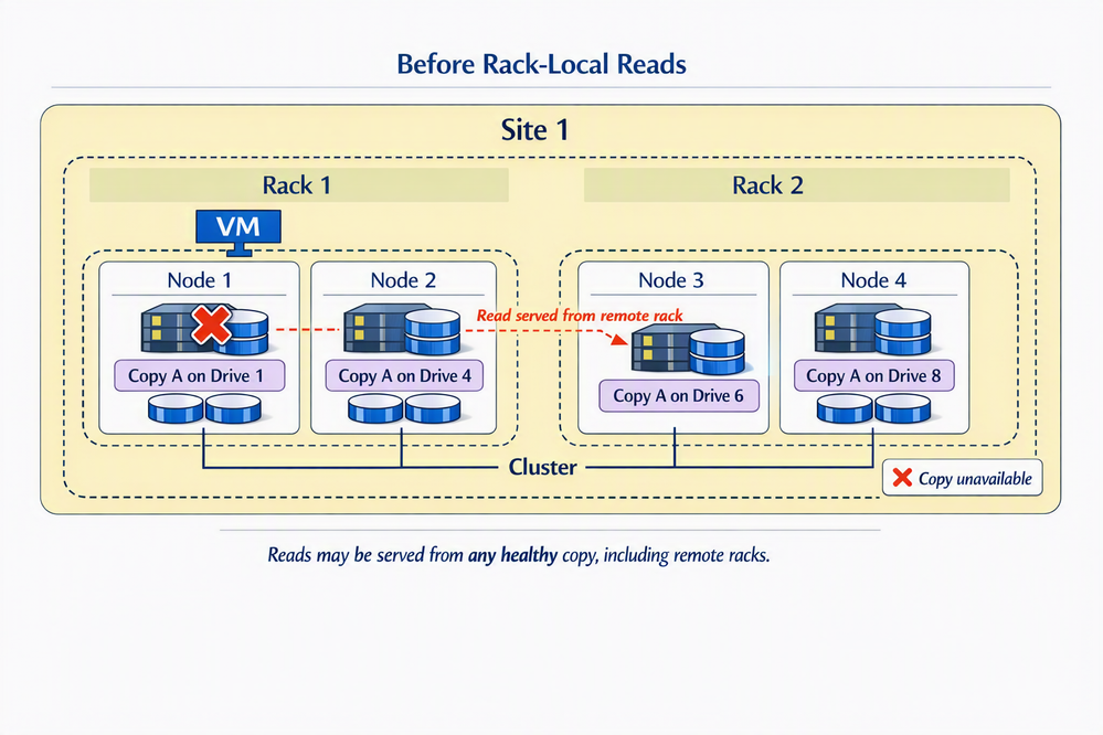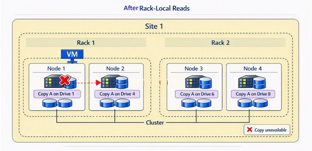 - Rack‑Local Reads evaluates the proximity of each healthy copy based on the fault domain.