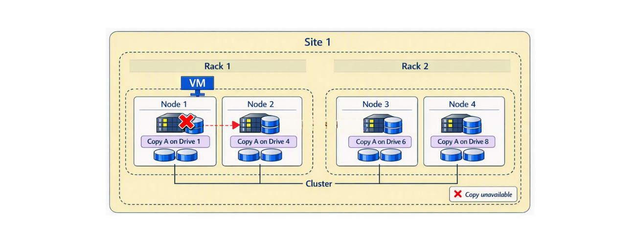 - The local copy on Node 1 (Copy A on Drive 1) is unavailable.