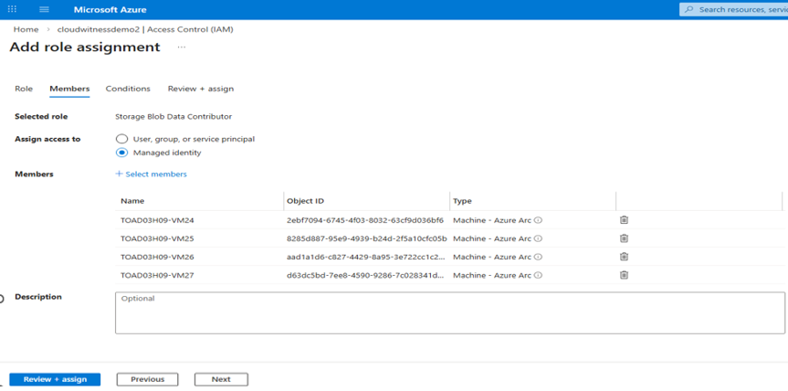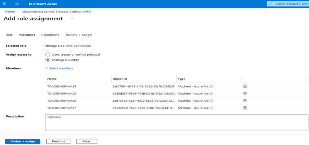 - Create cloud witness using the cluster nodes’ managed identity: