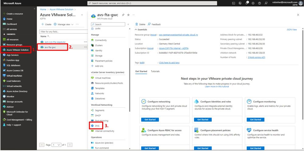 - In the navigation pane that now opened, scroll down to the section “Workload networking” and select “DNS”. The Azure Portal blade for configuring the Azure VMware Solution DNS configuration will now open.