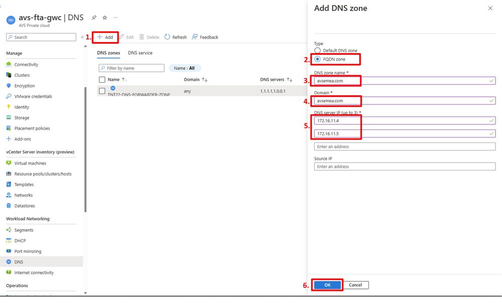 In the Azure VMware Solution DNS blade: