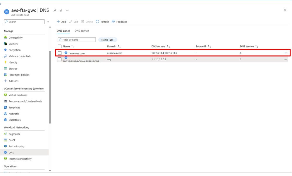 After a few minutes, the DNS FQDN zone, avsemea.com, will be listed in the DNS blade for your Azure VMware Solution Private Cloud as shown below: