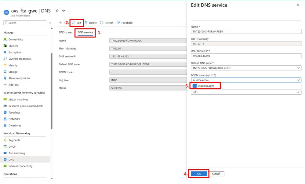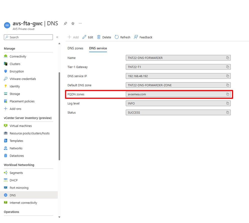 After this step the configuration of the Azure VMware Solution DNS service is complete. The next article in this series will describe the detailed steps in configuring LDAPS integration through the Azure portal or automation where possible.