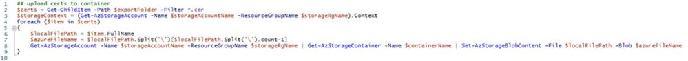Get-AzStorageAccount -Name $storageAccountName -ResourceGroupName $storageRgName | Get-AzStorageContainer -Name $containerName | Set-AzStorageBlobContent -File $localFilePath -Blob $azureFileName