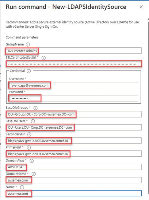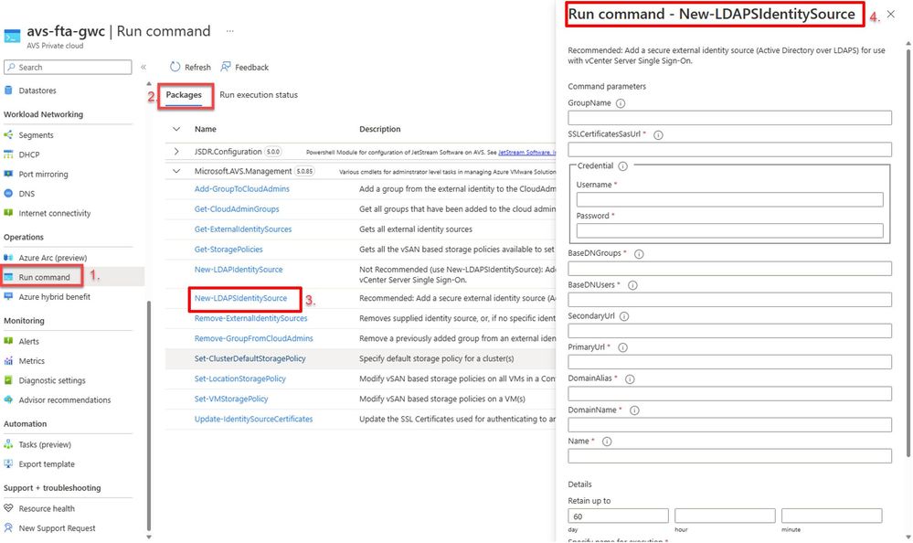 These steps, for now, are run manually from the Azure Portal. This will be found “Azure VMware Solution” and under Operations, Run command. Then select “New-LDAPSIdentitySource”. An automated way of executing the run-command is in the making. Please check back soon as this article will be updated as soon as this is available. Navigate to Azure Portal and ensure you are on AVS Private Cloud blade;