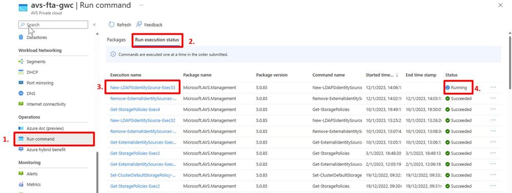 Once all information is entered, Run the command. You can check the status of the Run command within the portal. Navigate to Azure Portal and ensure you are on AVS Private Cloud blade