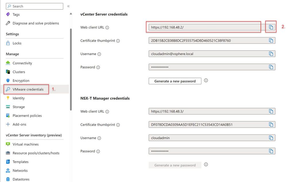 - In the AVS Private Cloud blade, click “VMware credentials”;