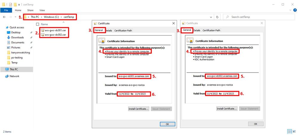 - Verify that domain controller fully qualified domain name FQDN) is present in the “Issued to” field. In our scenario: avs-gwc-dc001.avsemea.com and avs-gwc-dc002.avsemea.com.