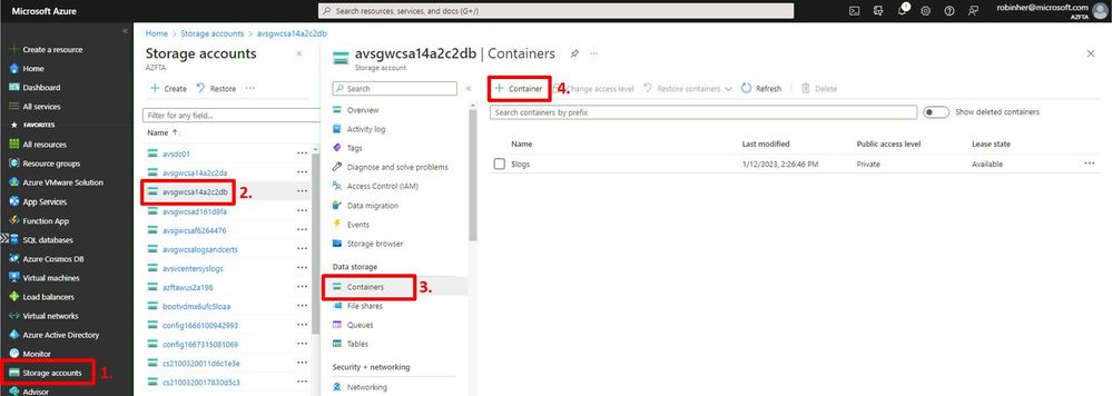 - In the Azure Portal, navigate to the avsgwcsa14a2c2db storage account created earlier and select “Containers”;