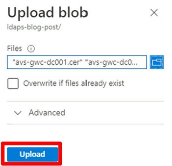The next step is to upload the domain controller certificates from the temporary folder where they were extracted to into the newly created ldaps-blog-post container in the avsgwcsa14a2c2db storage account we created. The following content is also divided into two sub-sections. One section will describe how the required procedure is performed manually through the Azure Portal and the other section describes a way to perform the required steps through automation.