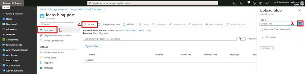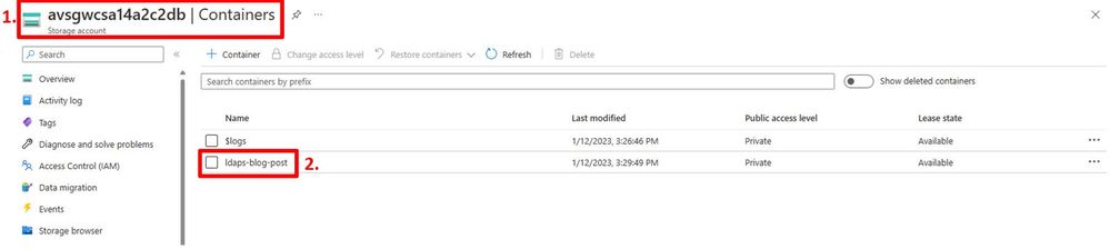 The next step is to create a blob container to help structure/organize the resources required for the LDAPS identity integration. The following content is divided into two sub-sections. One section will describe how the required procedure is performed manually through the Azure Portal and the other section describes a way to perform the required steps through automation.