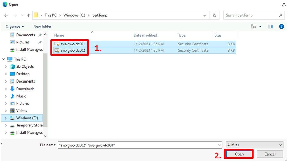 - Open Windows Explorer (or use the one opened in the previous step if not closed already 😊) and browse to the location where the certificates were extracted to. In our scenario the folder is c:\certTemp;