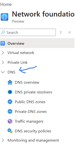 In the following snapshot à Azure Portal à Network Foundations à DNS, lets explore individual DNS Services offered and later in this document, we will interconnect