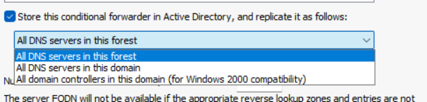 Note 1: Make sure you selected “All DNS Servers in this forest” for replication, otherwise users pointed to some other domain will be unable to resolve