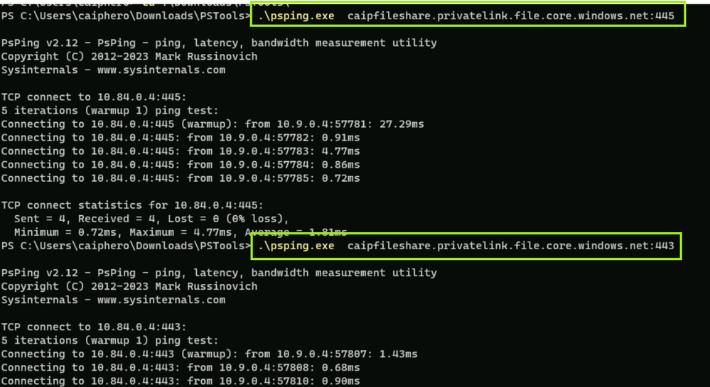PsPing, a tool from Sysinternals, is highly effective for verifying network connectivity from on-premises environments to Azure resources on specific ports. This is particularly useful when you need to ensure connectivity to ports such as 445, 443, 1433, 1521, or any other port required by Azure services you intend to access from either on-premises locations or other cloud environments.
