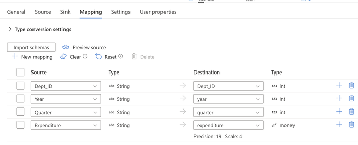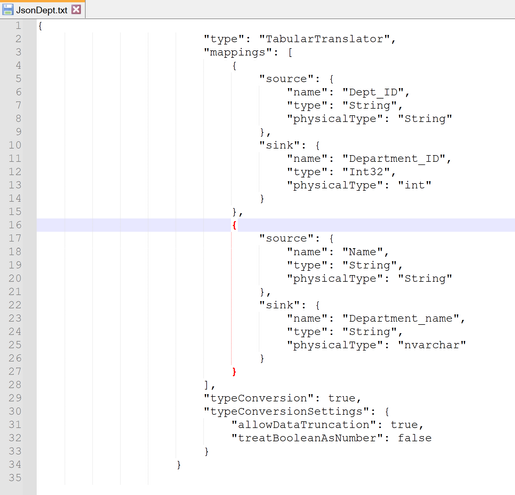 As you may have noticed some column names in the text files(SourceFiles) are different that what they are defined in the referencing target tables(TargetTables). This was done on purpose. There is a possibility that your source location may contain columns which may not be declared with the same name in the target tables. If you have static sources and static sink this mapping is easy via GUI. But what we are attempting here is to run a loop where the source and sink will keep changing as well as the column names and datatypes. We have hence created Parameterized Json scripts which we are being stored inside the metadata table under the TargetJson column. This will take care of the mapping when the pipeline is executed. Azure Data Factory copy activity will perform schema and data type mapping from source data to sink data.