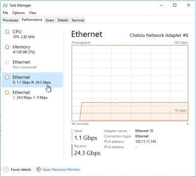 The CPU and memory are looking very low. This is the advantage that SMB Direct & RDMA offloading is bringing to the table; the server is left with all the resources to do its real job, and not deal with user-mode nonsense.