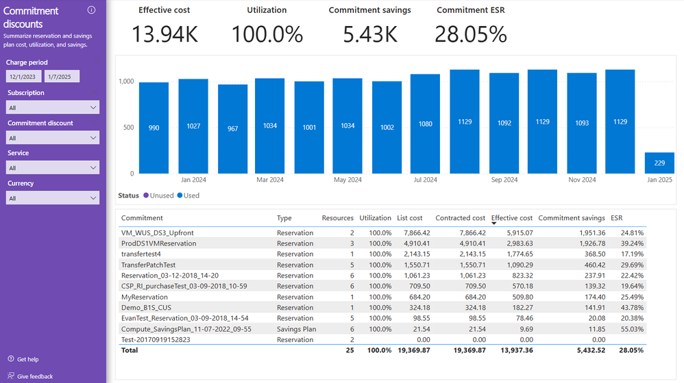 Next, we’ll look at the Commitment discounts page, which shows the list of commitment discount instances and a chart of used vs. unused costs. This page also shows utilization and savings per commitment discount instance.