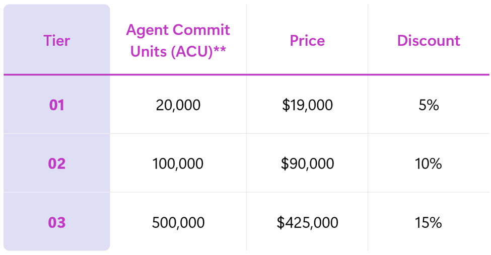 - Customers commit upfront to a lump-sum pool of Agent Commit Units (ACU) that can be used at any time during the one-year term.