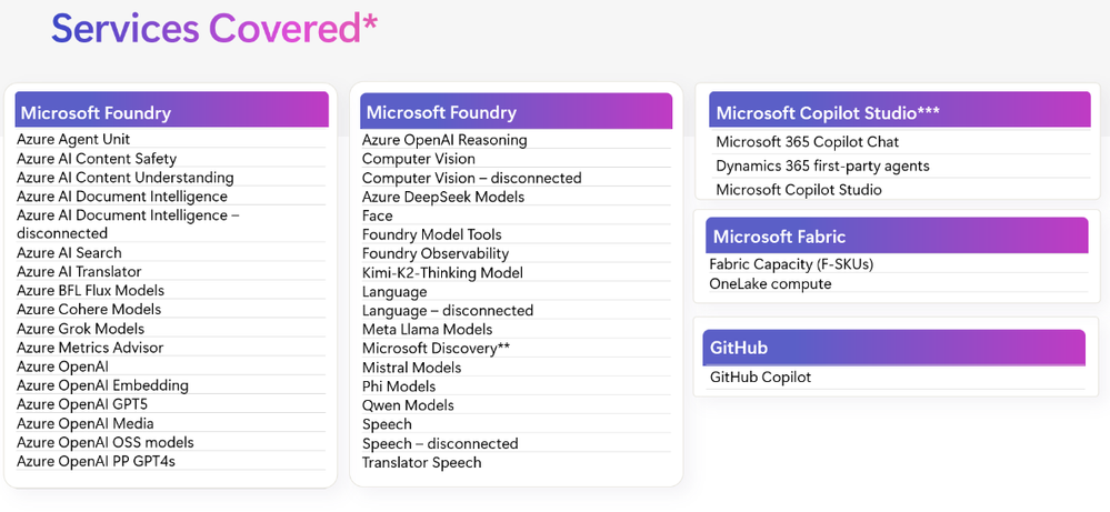 - One Plan: A single offer that spans Microsoft Foundry, Microsoft Copilot Studio*, Microsoft Fabric, and GitHub. No more siloed credits or SKU-level complexity, just one pool for all your AI workloads.
