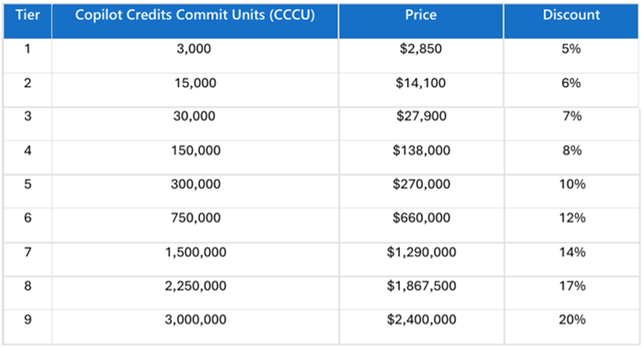 The P3 is a one‑year, pay‑up‑front option for Copilot Credits. You purchase Copilot Credit Commit Units (CCCU) and your usage automatically draws from this pool. Higher tiers unlock progressive discounts enabling more growth. See pricing here.
