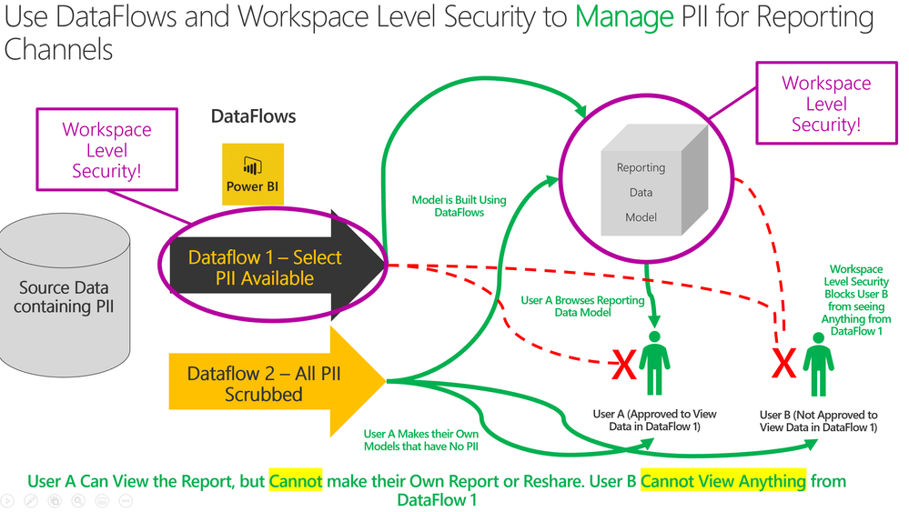- D.2 DataFlow 2 – DataFlow 2 contains data scrubbed of all PII that can be viewed by both User A and User B. Both User A and User B can use this DataFlow to build new self-service Power BI Models.