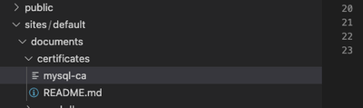4. Open Visual Studio Code and copy the downloaded certificate into the “/sites/default/documents/certificates” folder and rename it to “mysql-ca” with no file extension