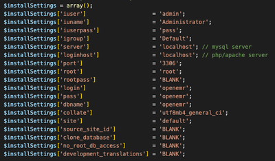 14. Execute the command “php -f InstallerAuto.php server=<server-name> loginhost=% root=<username> rootpass=<password> login=<openemr-db-user> pass=<openemr-db-pass>” using the username noted in step 5 for “root” and password noted in step 5 for "rootpass" and a username and password of your choosing for “openemr-db-user “openemr-db-pass”. You may optionally include any of the parameters located on lines 84-102 of “installerAuto.php” if you wish to change any settings from their defaults. For a production installation, it is recommended to change any username and password settings from their default value.