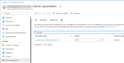 2) Click on the Server Parameters blade, select the All filter, search for sql_generate_invisible_primary_key and set to NO. Press Save