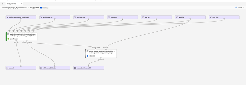 - MedImageInsight pipeline component (component) provides an end-to-end pipeline component that integrates all components into one workflow. It is a simple pipeline that trains, evaluates, and outputs the embedding and classification models