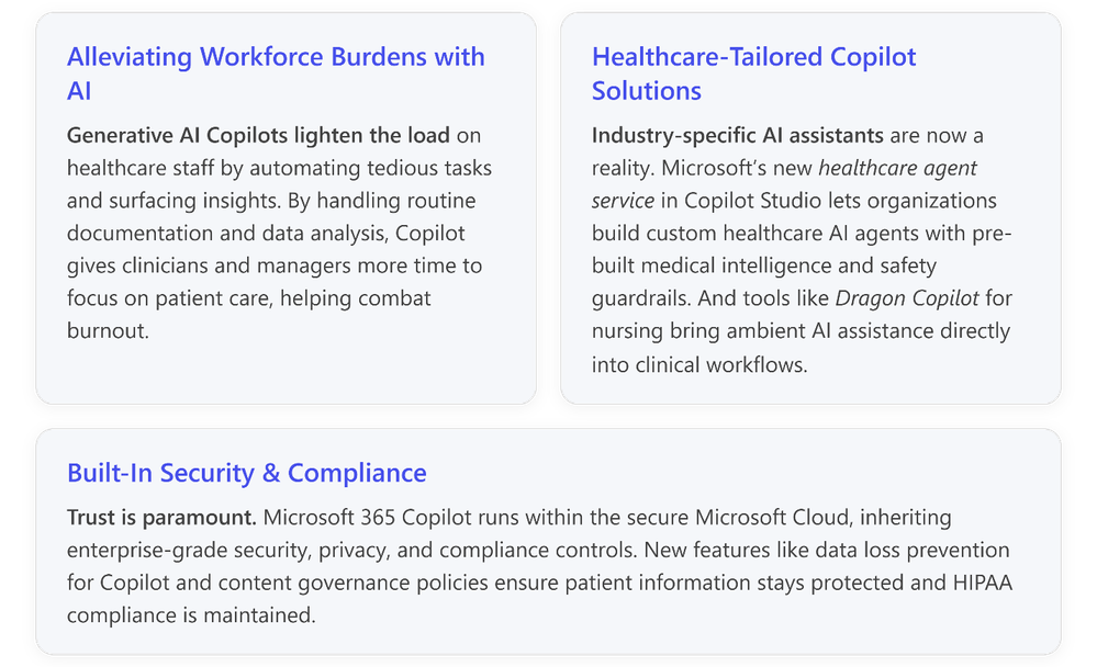 Each of these developments addresses a facet of healthcare’s needs – whether it’s reducing documentation drudgery, connecting siloed data, or enforcing privacy. Below, we dive deeper into how these Copilot capabilities benefit HLS users and provide concrete examples of their impact.