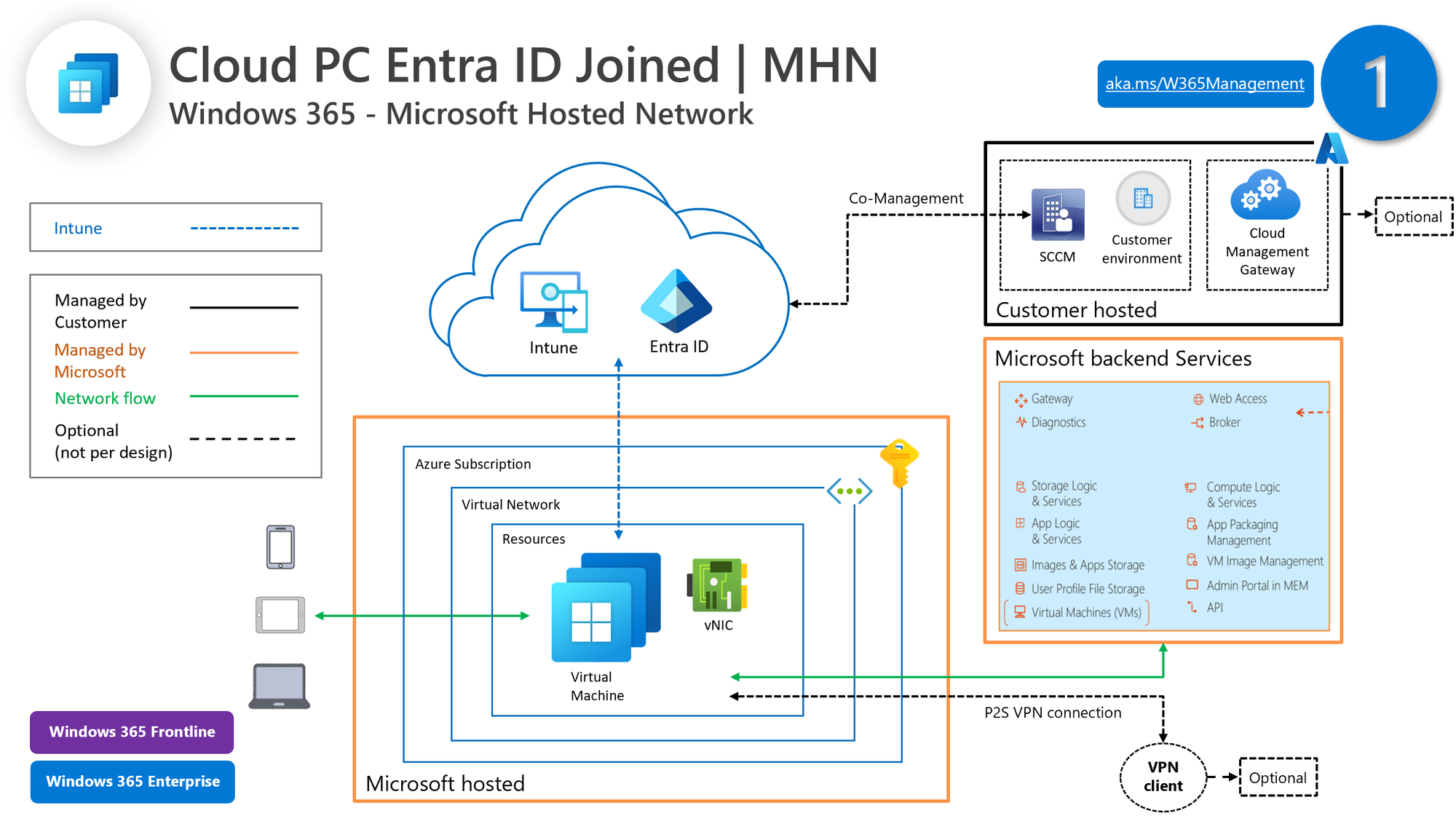 • Cloud PCs are hosted in the Customer Network and managed in the cloud (Microsoft Intune)