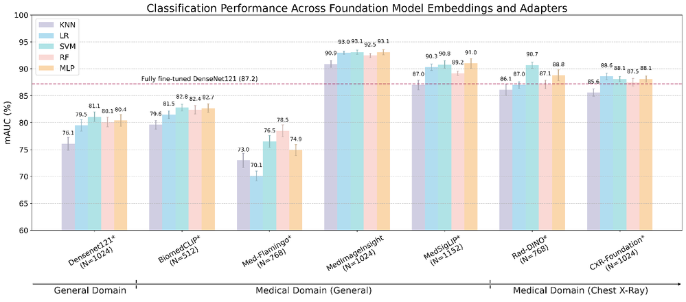 In collaboration with the University of Wisconsin–Madison, we conducted a study to answer these questions. The study has been presented at the Society for Imaging Informatics in Medicine (SIIM) conference and has been accepted for publication in the Journal of Imaging Informatics in Medicine (JIIM). A pre-print is available on arXiv: From Embeddings to Accuracy: Comparing Foundation Models for Radiographic Classification.