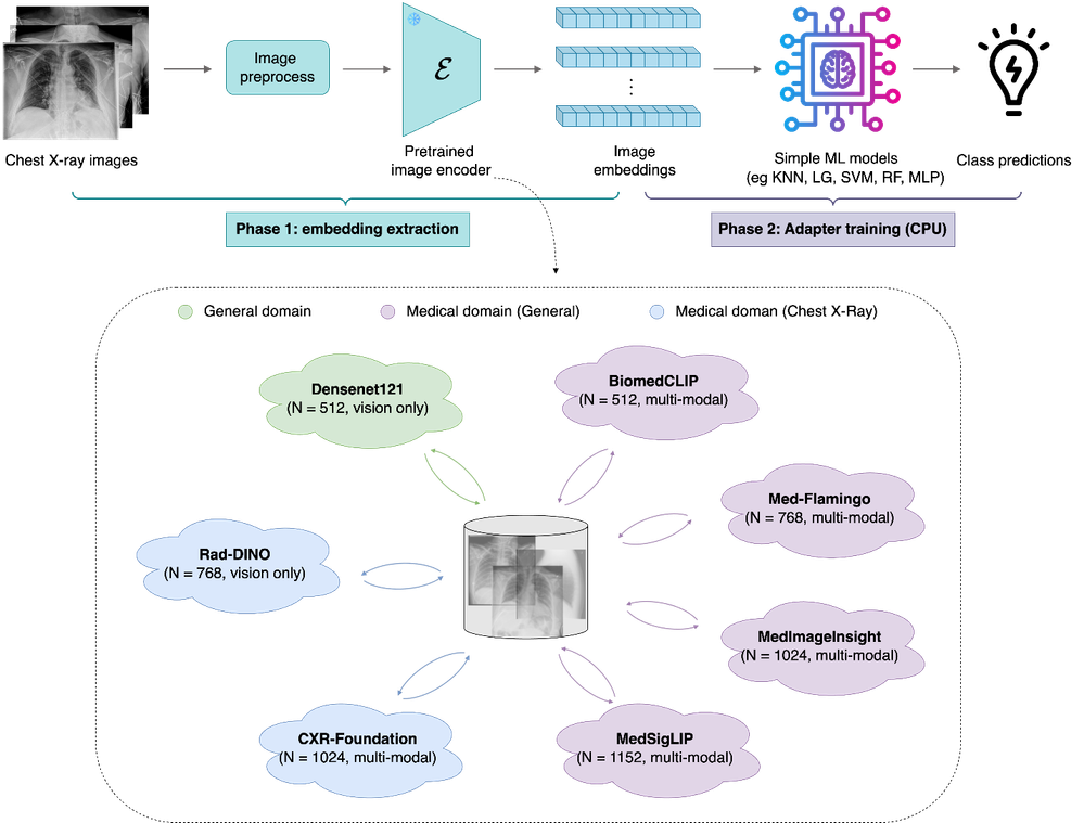 Figure 1 - Two-phase radiograph classification: embedding extraction using pre-trained foundation models, followed by lightweight adapter training for prediction.