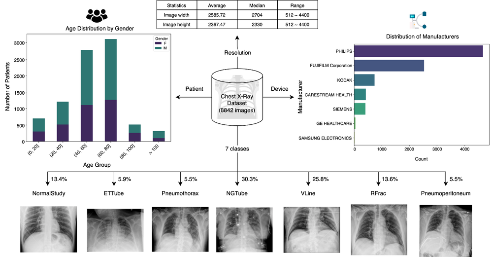Rather than relying on curated research datasets, we needed to validate performance under real-world conditions with all its messy complexity. Thanks to researchers at the University of Wisconsin School of Medicine and Public Health, we were able to evaluate using 8,842 chest radiographs from 7,045 patients across seven diagnostic categories. Cases were identified through keyword searches and validated through joint review by a medical physicist and board-certified radiologist, with adjudicated reports serving as the reference standard. All images were acquired using modern CR (computed radiography) or DR (digital radiography) systems, ensuring contemporary clinical imaging quality. We focused on data that radiologists encounter frequently and data that reflects the practical challenges of clinical deployment such as imaging artifacts, varying scanner manufacturer and quality, diverse patient demographics, and natural imbalanced class distributions. This assessment challenges the models’ ability to distinguish between normal anatomy and six distinct pathological or procedural findings.