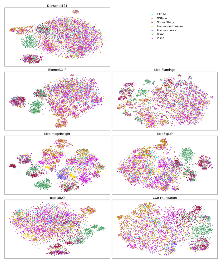 Figure 4 - Embedding visualization showing how each foundation model clusters similar diagnostic cases. Better separation indicates higher quality embeddings for classification.