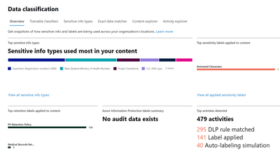 - You will see links in each sub-pane in this dashboard. These will allow you do drill down into the information provided, or you can click on the links across the top. We will only be working in the Sensitive information types tab.