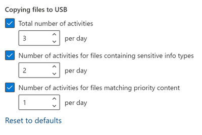 - Now you will choose which events will trigger an Insider Risk Management (IRM) alert. This is found in the Triggering thresholds for this policy.