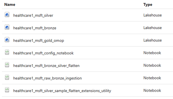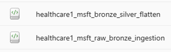 - Healthcare1_msft_raw_bronze_ingestion – Responsible for ingesting the FHIR sample data (NDJSON files) into parquet tables within the bronze lakehouse.