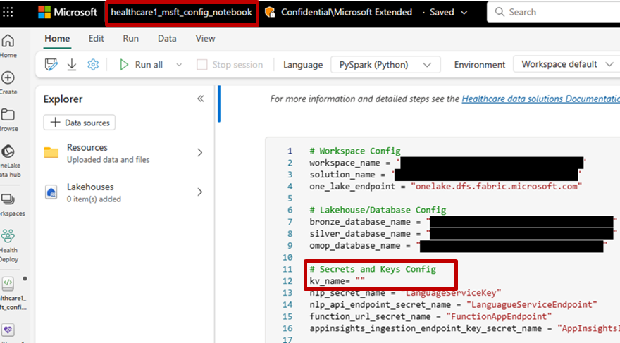 After setting the spark runtime to version 1.2, the next step is to update the key vault setting within the healthcare1_msft_config_notebook. This notebook is used to store all the configuration settings related to healthcare data solutions. The key vault setting is specifically used in conjunction with the FHIR data ingestion and ensures that the transformations are accessing services and data in a secure manner. Because we aren’t planning on leveraging the FHIR data ingestion capability for this exercise, we will leave this value blank and save the notebook.