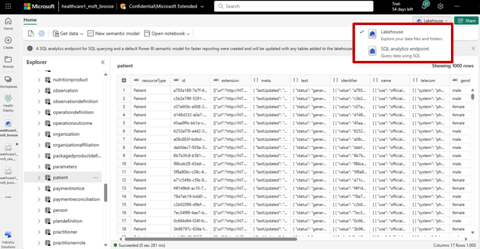 With the lakehouses hydrated we can now open them to view the tables, columns, and data within. When viewing the lakehouses, you can either choose to use the lakehouse viewer or SQL endpoint. This gives you the flexibility of accessing the tables using either notebooks or through SQL queries.