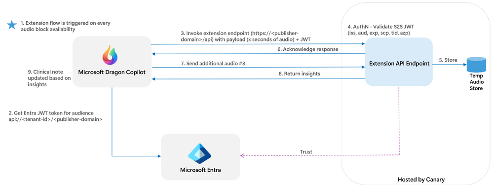 The following diagram shows the data flow between Microsoft Dragon Copilot and partner endpoints that provides extensions such as Canary, via infrastructure designed to enable HIPAA compliance, access to the encounter audio data. In addition to audio, other data elements such as turn transcript and the clinical note can also be made available to extensions.