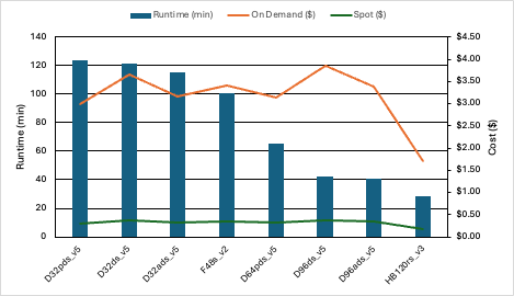 - Improvement: The turnaround time for the Standard_HB120rs_v3 decrased slightly to 28 minutes, with a decrease in Spot cost by $0.07. Additionally, a new option is available on the Standard_D96ads_v5 instance with a slightly longer turnaround time of under 40 minutes but at a higher Spot cost of $0.34 compared to $0.11.