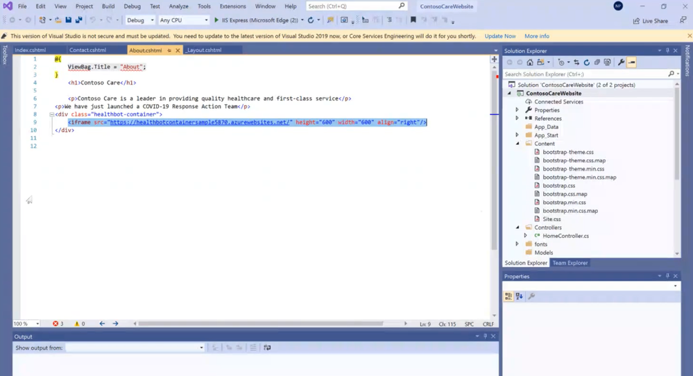 2. Open visual studio for the code. Embed an iFrame as a tag. The source is the app service that is hosting the health bot. Front-end developers can then play around with this code.