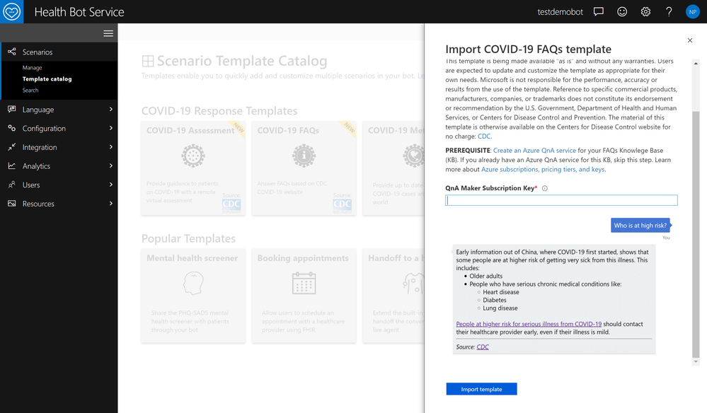 1. Login to health bot admin portal. Navigate to Scenarios -> Template Catalog. Click on COVID-19 FAQs template and import the template by providing a QnA Maker subscription key. If you do not have a QnA Maker service provisioned, create one on Azure portal.