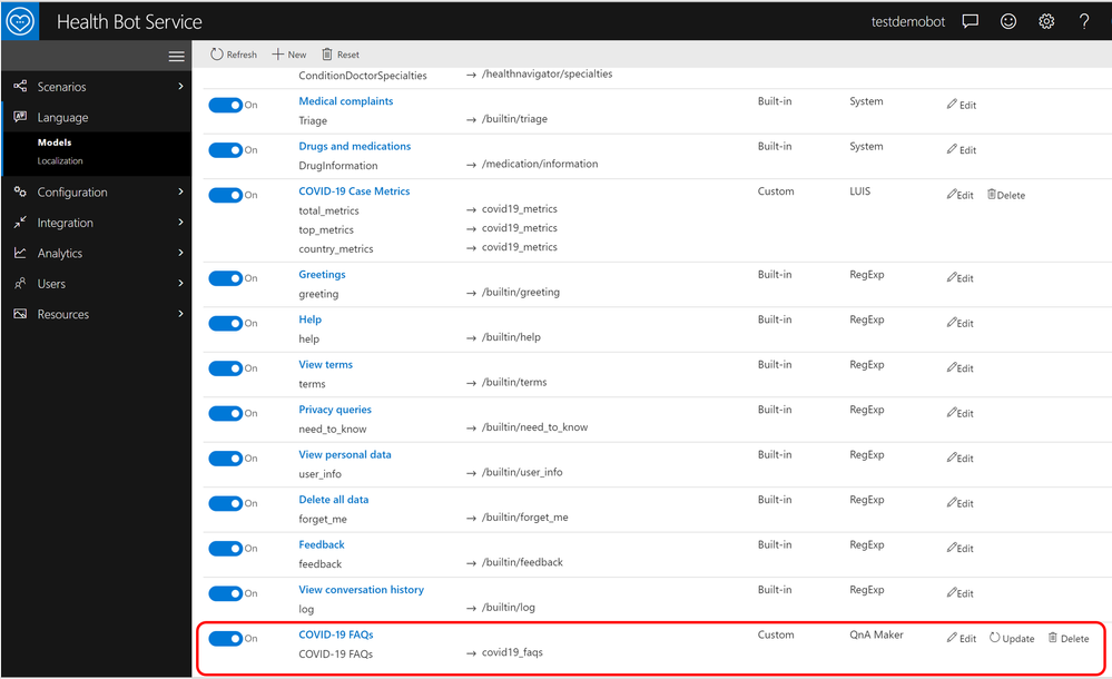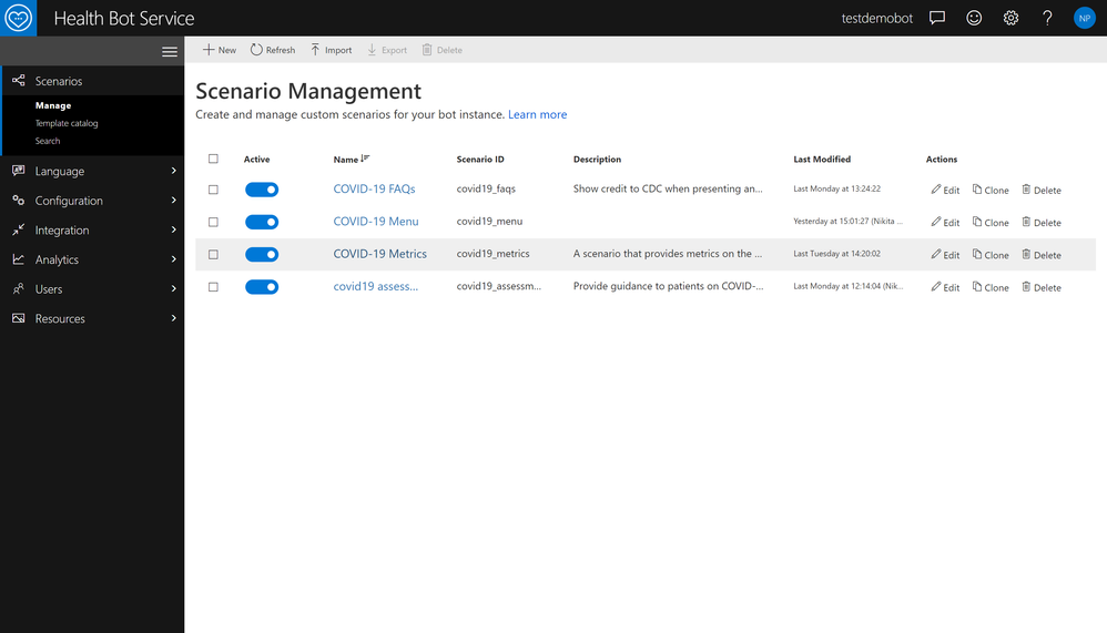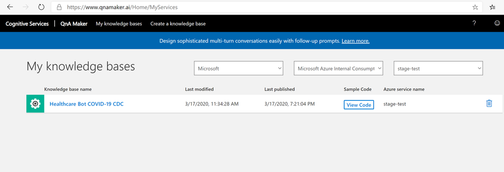 6. The import template creates a scenario, it’s underlying language model as seen above and a Knowledge Base "Healthcare Bot COVID-19 CDC" in the Azure QnA Maker service using the subscription key provided during import step. More information on updating knowledge base can be found here.