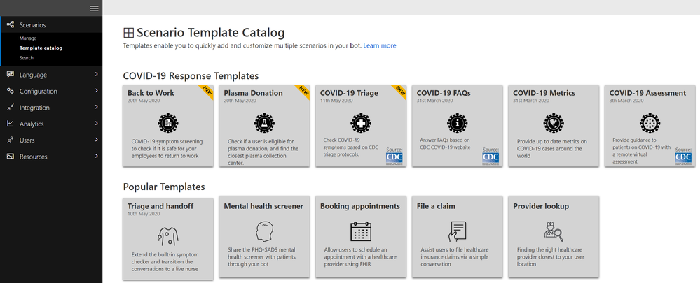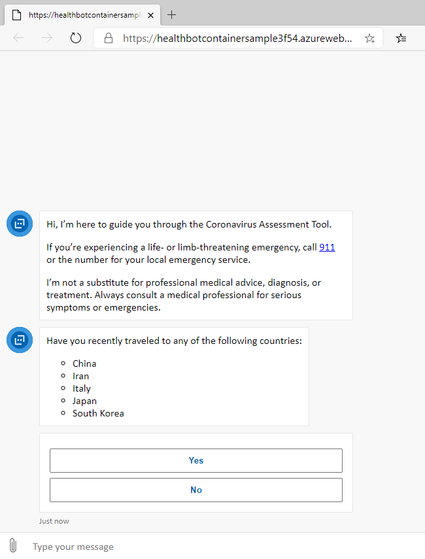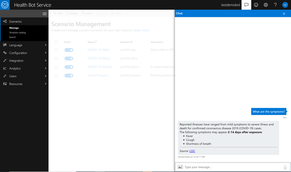 The Healthcare Bot Service is an AI-powered, extensible, secure and compliant healthcare experience. Microsoft now has a specific template pre-built for COVID-19 Assessment. It takes inbound requests, asks about the patient’s symptoms, and assists in getting people access to trusted and relevant healthcare services and information based on the CDC recommendation.