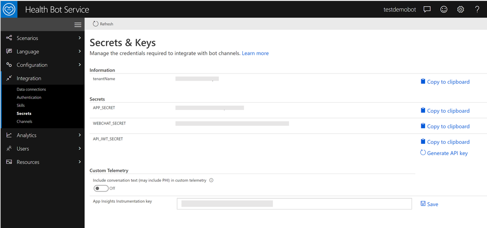 2. Webchat_secret allows you to connect the bot to a web page, just like Azure Bot framework. The web chat channel is enabled by default. Copy the webchat_secret and the app_secret. More details here on embedding your health bot into your app via web chat.