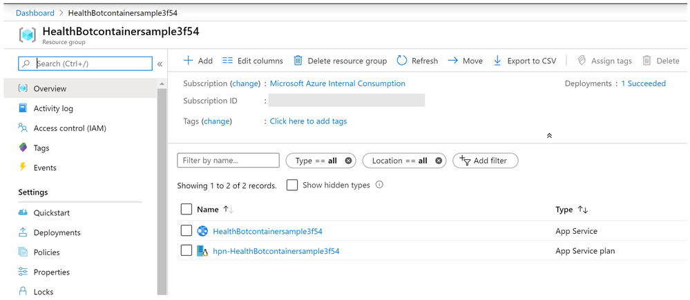 5. Click on the Resource group that you created/chose in previous step. The deployment step creates two services in this resource group: an app service and an associated app service plan.